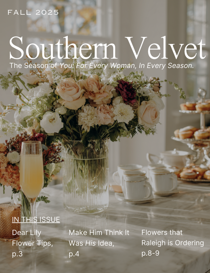 Southern Velvet is a quarterly digital magazine for women who love flowers, elegant hosting, and the little rituals that make everyday life feel special. Inside each issue, you’ll find seasonal floral styling, thoughtful hosting inspiration, and the kind of quiet luxuries that make a house feel like a home, even if you're just setting the table for Tuesday night. We believe in living beautifully, and that flowers, a flickering candle, and a handwritten note still matter.